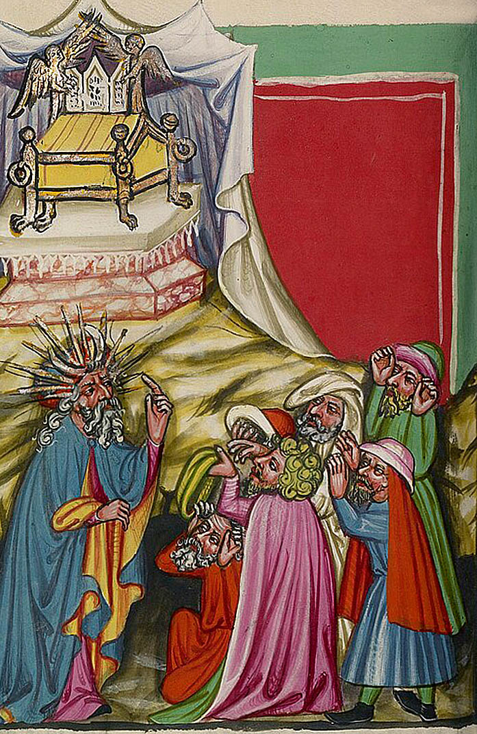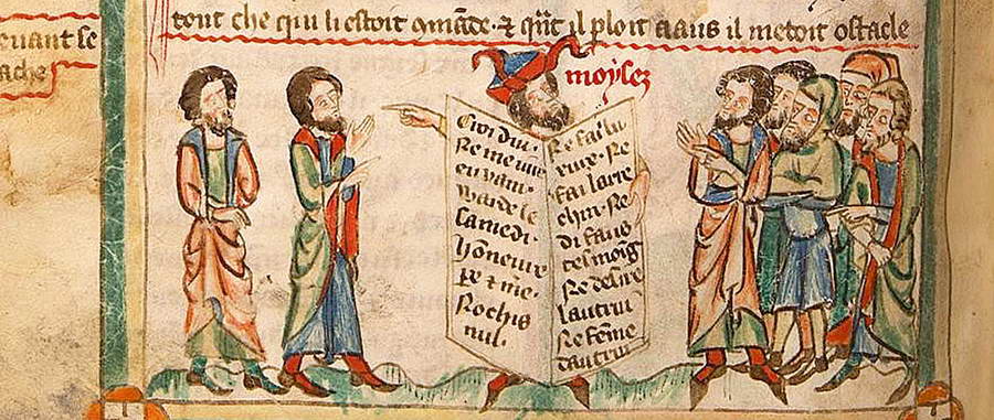 Создатели некоторых изображений пошли любопытным путем. Они представили пророка не с рогами, растущими из головы, а в раздвоенной, словно двурогой, шапке. В одной французской рукописи XIV века Моисей, держащий скрижали с заповедями, одет в невысокий головной убор с двумя красными лентами, поднимающимися вверх, словно рога. Как сказано в тексте, сопровождающем эту миниатюру, пророк вернулся к евреям «рогатым» и не знал, что лицо его сияет настолько ярко, что никто из людей не способен на него взглянуть.