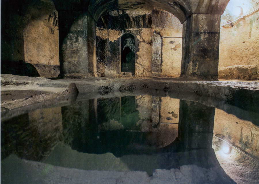 Еврейская община спрятала микву в 1493 году, и, «поскольку миква находится ниже уровня пола, ее забросали землей, благодаря чему она прекрасно сохранилась», — объясняет Даниэле. Пришлось извлечь несколько грузовиков земли, чтобы вновь открыть великолепные арки и стены, вырезанные в известняке на глубине 3,5 метра. Миква состоит из пяти бассейнов и наполняется дождевой водой, поэтому в особых случаях в нее до сих пор можно окунуться.