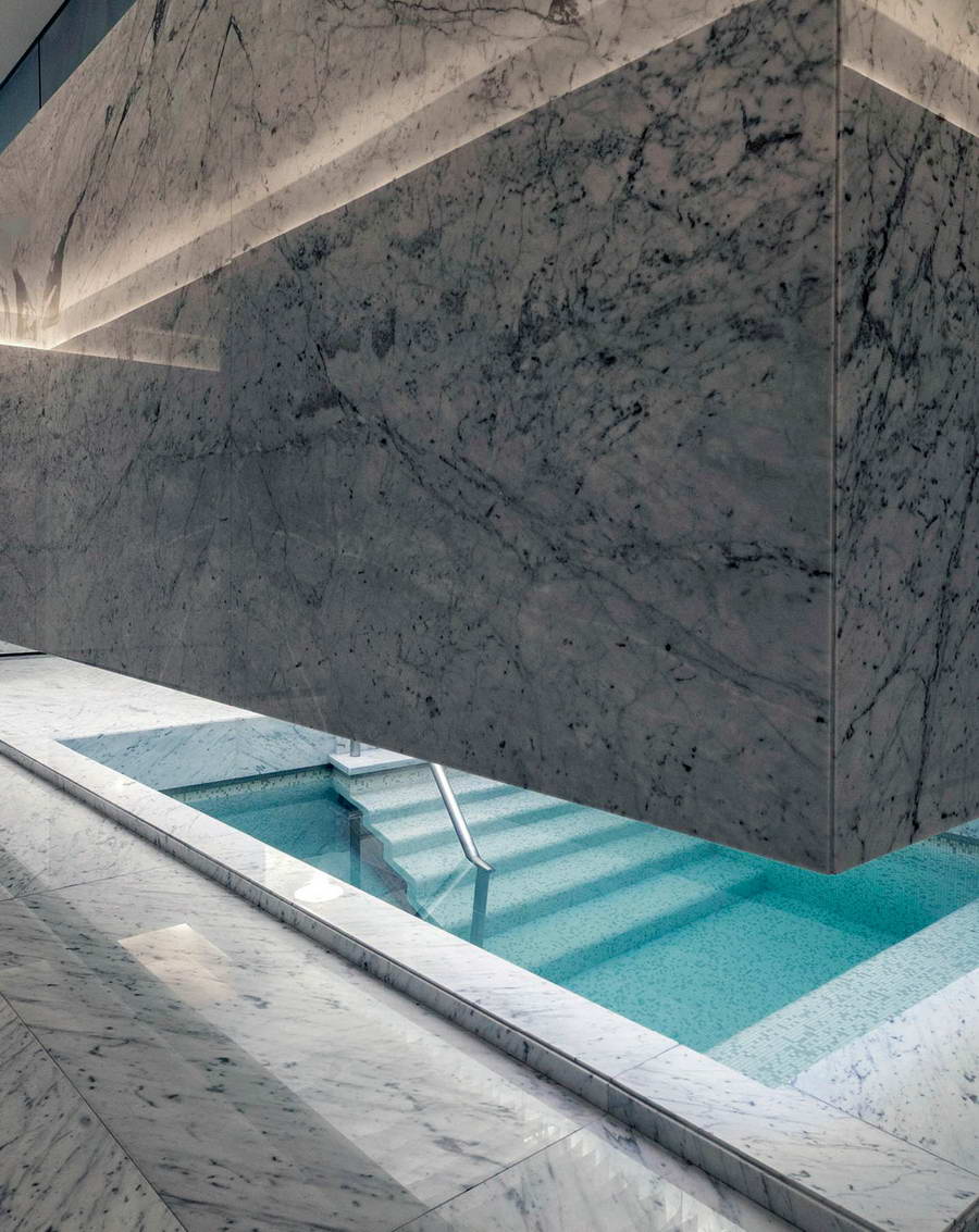 Дизайнер Эйб Джером активно использовал игры со светом и цветом: лобби темное, раздевалки светлые, а помещения с бассейном «поражают буйством красок после монохромного холла». Он объясняет: «Мы хотели сделать помещения максимально роскошными, но при этом чтобы они были комфортабельными, теплыми и приятными, как бабушкина гостиная».