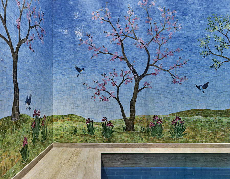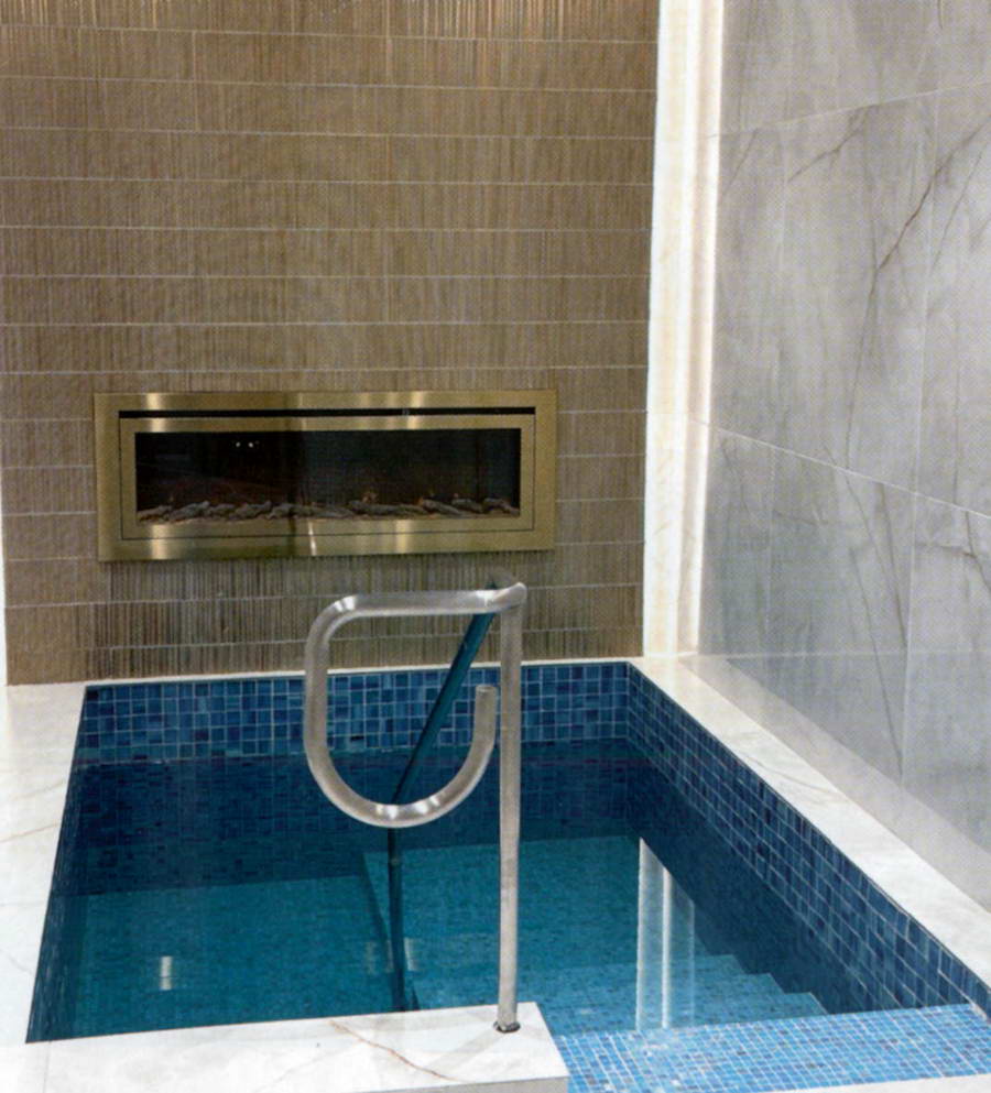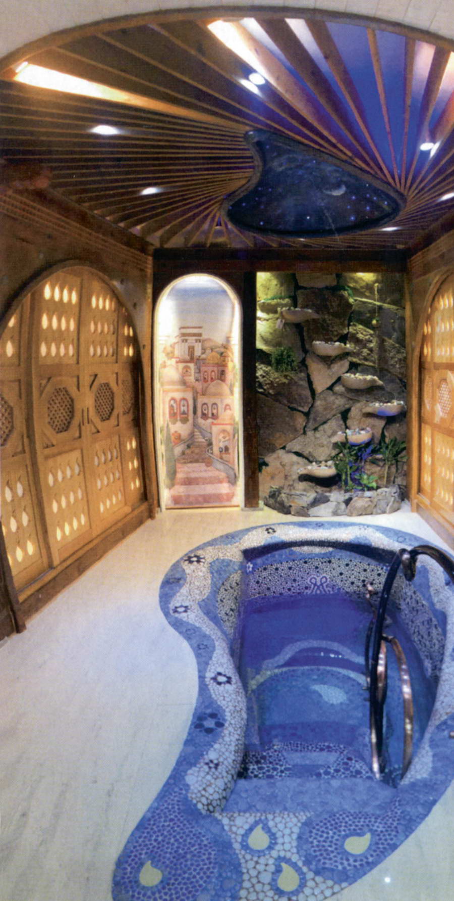 Стены и пол в помещении с бассейном отделаны светлым кафелем, а сам бассейн голубой мозаикой. «Контраст между светом, однотонной плиткой и ярким голубым цветом визуально напоминает воду, текущую по пустыне», — говорит один из архитекторов, Менахем Шейнин, который постарался подчеркнуть в своей работе мотивы покоя и простоты.