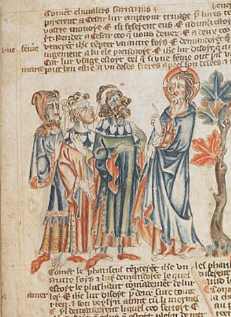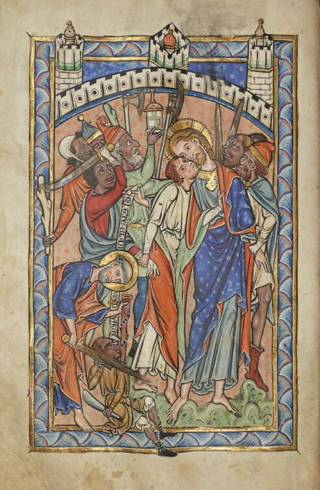 В этой рукописи авторы коварного вопроса о лояльности Римской империи были подписаны не «иродианами», а «сарацинами». На миниатюре перед Христом стоят три человека. У первых двух толстые, как у африканцев, губы, вздернутые носы с большими ноздрями, а на головах — белые повязки‑тюрбаны. Лица их почти синего, неестественного цвета. Чтобы демонизировать фарисеев, их отождествляют с сарацинами. Чтобы демонизировать сарацин, их отождествляют с фарисеями. И все они приобретают такой цвет лица, который сразу противопоставляет их светлоликим Христу и его ученикам.