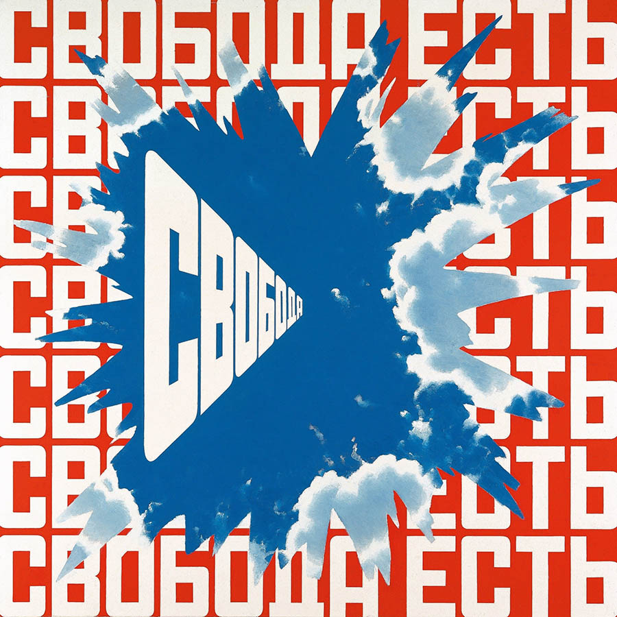 «Добро пожаловать», «Живу — вижу», «Тучи растут», «Свобода есть свобода» — все эти работы Булатова с говорящими названиями, которые смотрят на нас с холстов, мгновенно возникают в памяти, стоит упомянуть автора. Гигантские красные буквы «СЛАВА КПСС» почти полностью закрывают квадрат окна, словно преграждая путь в небо. Но скользящие по небосводу облака отрывают коммунистический лозунг от плоскости и убеждают нас, что шанс просочиться наружу есть, и в заборе, сложенном из букв, брешь найдется, стоит только поискать.