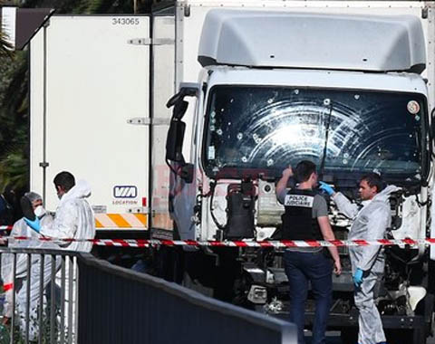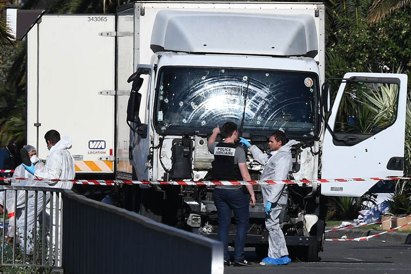 - Криминалисты осматривают грузовик, который Мохаммед Бухлель использовал при совершении теракта. Ницца. 16 июля 2016. AFP Photo / Anne‑Christine Poujoulat