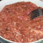 Мякоть говядины пропускается через мясорубку с крупной решеткой. Лук репчатый режется очень мелко, но вручную и через мясорубку не пропускается. Смешивается он с мясом, заправляется традиционными специями — и вот уже готова масса, которой наполнят колбасу.