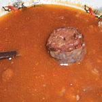 Ингредиенты: 500 г мякоти говядины, 300 г сухой красной фасоли, 500 г колбасы рури, одна среднего размера луковица, 100 г риса, 1 ст. л. томатной пасты, соль, перец черный и красный острый по вкусу.