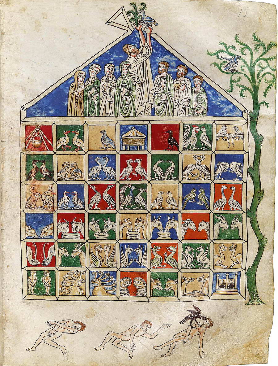 Несколько лет назад, перелистывая одну средневековую рукопись «Апокалипсиса», я наткнулся на необычную таблицу с разноцветными ячейками. В каждой из них помещено по одному или двум зверям. Таблица увенчана двускатной крышей, под которой собралась большая семья: несколько мужчин и женщин. Это дом? Да, но непростой: дом‑корабль, Ноев ковчег.