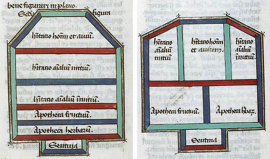 Как же этот ковчег выглядел? Тут существовало множество вариантов. Порой его представляли в виде здания с пирамидальной крышей или громадного сундука, порой — судном (например, в северной, скандинавской и англосаксонской иконографии оно могло напоминать огромный драккар). Существовали изображения ковчега с оконцами, из которых выглядывали обитатели, а были такие схемы, которые стремились передать не внешний облик корабля спасения, а его внутреннее устройство — структуру палуб.