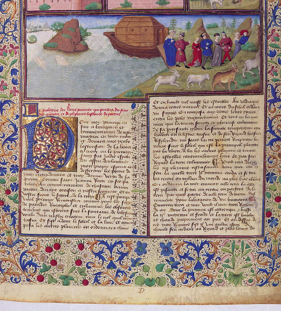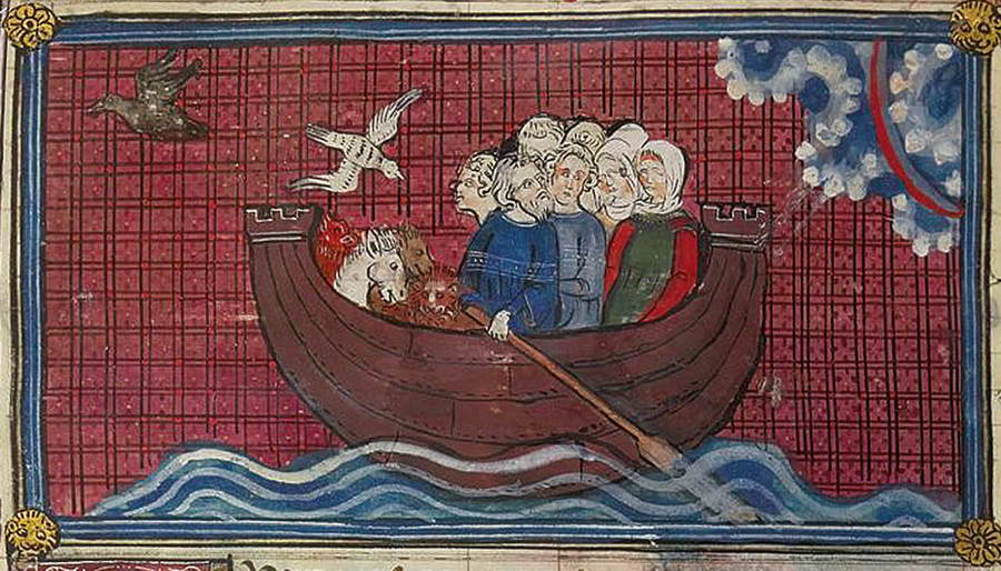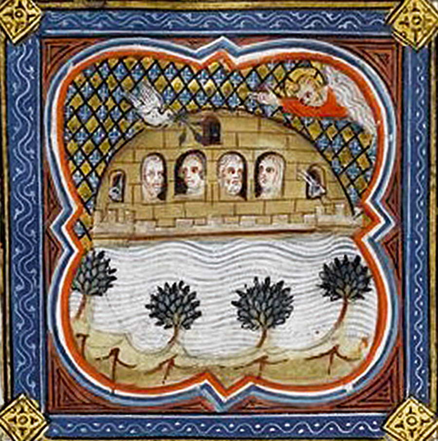 На этой миниатюре, под самой глубокой «палубой» ковчега, в которую поселили опасных и демонических «бестий», а также поместили отсек с нечистотами, на невидимых волнах качаются трупы утонувших грешников. Одному из них ворон, как положено, выклевывает глаз. Эта миниатюра не только представляет все разнообразие живых существ, но и выстраивает их в моральную иерархию: от праведного голубя, олицетворявшего избранных, к нечестивому ворону, чья чернота напоминала о проклятых.