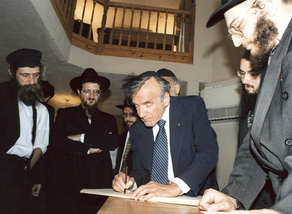 - Слева направо: р. Давид Карпов, р. Берл Лазар, р. Авраам Бекерман, Эли Визель, р. Давид Мондшайн, Борух Горин в синагоге в Марьиной роще. 1997