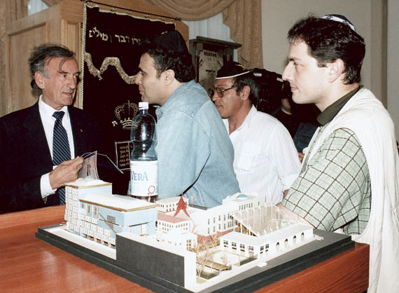 - Эли Визель общается с журналистами. На первом плане макет Московского еврейского общинного центра. 1997