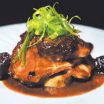 Таким образом, соус готов, и мы вернемся к языку. Кусочки его можно обжарить на стейковой сковороде — тогда на нем появятся полоски, как после решетки мангала. Сложить готовые обжаренные кусочки языка на тарелку и полить их соусом.