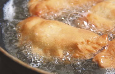 Тесто раскатываем и вырезаем кружочки диаметром 10–12 см, толщиной примерно в сантиметр. На кружочки выкладываем фарш и защипываем как украинские вареники со змейкой. Готовые пирожки обжариваем в глубоком масле до приятного золотистого цвета. И как только остынут — спешите есть.