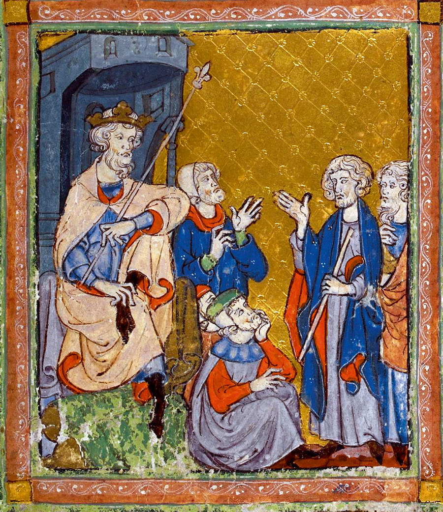 Справа — Моше и Аарон. Они стоят и говорят, вторгаясь в то пространство, которое им не принадлежит. Один из них произносит слова, сопровождая речь открытым жестом руки. Другой стоит рядом, поддерживая миссию своим присутствием. Это не дублирование и не второстепенная фигура: миниатюра точно отражает библейскую структуру, где Моше говорит от имени Б‑га, а Аарон становится его «устами» в публичном пространстве. Они действуют как единое целое.