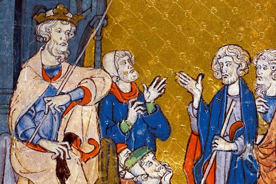 Именно в этом контексте нужно смотреть на миниатюру, на которой Моше и Аарон приходят к фараону с требованием: «Отпусти Мой народ». Это начальная точка Исхода, момент, когда история впервые произносится вслух в пространстве власти.