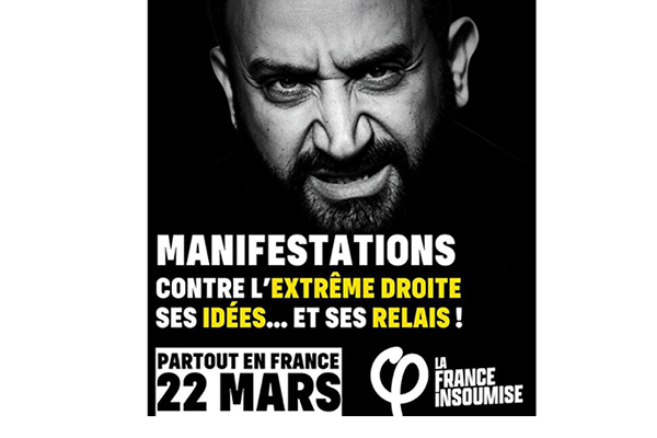 12 марта 2025 года партия «Непокорённая Франция» (La France insoumise, LFI) опубликовала в социальных сетях агитационный плакат, вызвавший широкий общественный резонанс. В рамках кампании против крайне правых LFI призвала граждан присоединиться к демонстрации 22 марта, но сопровождала призыв изображением известных французских медийных лиц, включая телеведущего Сирила Хануна и журналиста Паскаля Про.