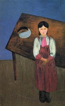 У стола стоит девочка в малиновом сарафане, в грубых катаных валенках. Она о чем-то глубоко задумалась, традиционно по-крестьянски сложив руки на животе. В ее позе, выражении лица и взгляде есть что-то сиротливое, одинокое, неустроенное. Но жалости Аниська не вызывает. И сострадания не просит. Ее нежный, чистый, типично русский облик с выложенными на лбу темными волосами будто освещен изнутри. Эта девочка несет в себе свет. В ней живет трезвая и суровая вера в добрый мир, живет надежда на то, что все образуется, устроится к лучшему. Вся картина согрета огромным сердечным теплом художника, который спрессовал время в комок. Острый ракурс стола подчеркивал главное – драгоценный хлеб.