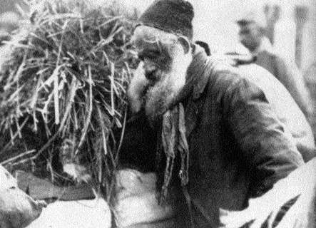 «Неожиданно появляется странная процессия. Впереди стражник с винтовкой. За ним четыре старых еврея. Шествие замыкают два конных стражника. У евреев усталый забитый вид. Они еле ковыляют, подгоняемые охраной.
