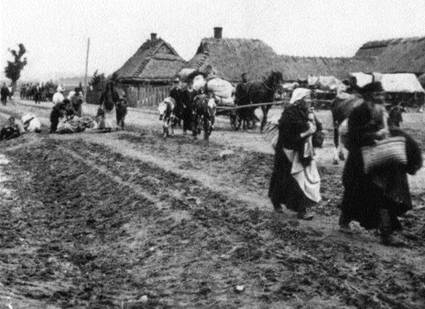 Во время своих разъездов по фронту я часто встречал группы этих несчастных бесприютных людей, направлявшихся неизвестно куда и зачем. Одни шли пешком, другие сидели на возах, нагруженных всякой старой, наскоро захваченной рухлядью, из ворохов которой высовывались испуганные курчавые головки грязных ребятишек или торчали бороды древних стариков. Лица у всех были хмурые, многие женщины и некоторые мужчины плакали... »