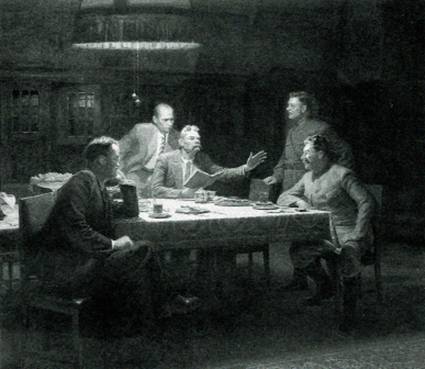 Картина художника А.Н. Яр-Кравченко: «А.М. Горький читает И.В. Сталину, В.М. Молотову и К.Е. Ворошилову свою сказку “Девушка и смерть”».