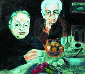 – Первое – я переделал чужую картинку. Там были розы на окне. Мне не понравилось – и я фон переделал. Смотрю: она заиграла! Тогда я попробовал собственный автопортрет: вот он. (Показывает в каталоге. – Т.Б.) Еще слабо, но что-то есть, лучше, чем первое стихотворение. Еще попробовал, и еще. «Что такое? – думаю. – Мне надо книгу писать, а я закончу одну картинку, и сразу возникает новая идея…» Сначала писал на бумаге, сам себя стеснялся, холсты не покупал – мне, мол, не по чину. Если куплю холст, то получается, что я всерьез художник. Да? А я не художник, а я просто так… Малюю… То, что я малевал, листки бумаги – стал я прибивать к стенке. И когда на них кто-то обратил внимание и сказал, что «в этом что-то есть», я сначала был вообще-то очень удивлен. Это мне понравилось, но я долго думал, что меня хвалят – просто чтобы приятное сказать. Я в себе сомневался… Однако три года писал только картины. Три года практически ничего не зарабатывал.