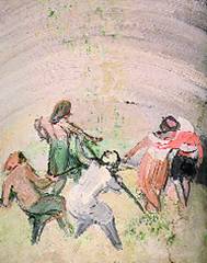 А вот герои Меера из цикла «В степи»: внешне беззаботные коммунары, их работа, карнавал. Но в портретных зарисовках угадывается совсем не беззаботная скрытая мысль, роднящая этих персонажей с другими героями художника.