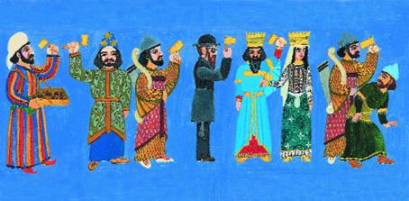 Мордехай возвращается к Ахашверошу и Оману. Пируют.