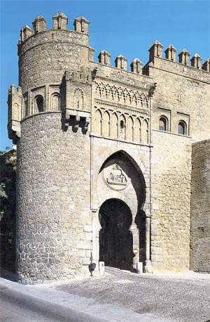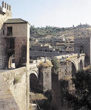 Но не станем торопиться в город. Для начала лучше прогуляемся по периметру крепостных стен. Если ехать из Мадрида, то первое, что вы увидите, – это ворота Пуэрта-де-Алькантара. Именно через них вы попадете за древние крепостные стены, перейдя Тахо по мосту Алькантара. Этот мост построили еще во времена римлян, и долгое время он был единственным «входом» в город. Первоначально с обеих концов он был защищен мощными крепостными башнями, но в середине XVIII века, во время правления Карлоса III, внешняя башня была снесена, а на ее месте появилась красивейшая барочная арка. Сами ворота Алькантара (историки датируют их X веком) – интереснейший образец арабских ворот с двойным доступом, конструкция которых не давала врагу возможности использовать таран. Чтобы войти через такие ворота, требовалось миновать первую арку, свернуть и пройти несколько метров между двумя крепостными стенами, наружной и внутренней, и только через вторую арку можно было проникнуть внутрь крепости. Всего до настоящего времени в Толедо сохранилось восемь городских ворот. На севере это ворота Пуэрта-де-лос-Аларконес, Пуэрта-дель-Соль – знаменитые Врата Солнца, построенные в XIV веке по приказу архиепископа Педро Тенорно и исполнявшие, по всей вероятности, только лишь декоративную функцию, – и Пуэрта-де-Вальмардон, Х века постройки. Эти ворота – единственные, сохранившие первоначальный арабский вид, несмотря на то что уже после Реконкисты – отвоевания Испании у мавров – были попытки переделать арабскую подковообразную арку ворот в полукруглую. А неподалеку находятся ворота Пуэрта-Нуэва-де-Бисагра и Пуэрта-де Альфонсо VI.