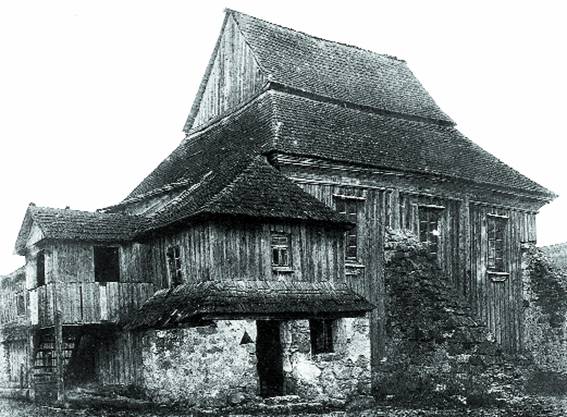 Большая синагога в Миньковцах, общий вид. Фото 1920-х годов из коллекции С.А. Таранущенко (Национальная библиотека Украины им. Вернадского, Отдел рукописей, Ф. 278).