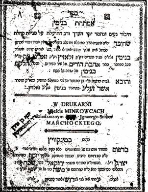 Согласно «ведомости», поданной подольским губернатором Иваном Эссеном, еврейские типографии в Миньковцах были открыты в 1792 и 1802 годах «с разрешения помещика Мархоцкого»[14]. «Ведомость о еврейских типографиях», составленная в Министерстве народного просвещения в 1827 году, утверждает, что еврейская типография «заведена [в] 1792 году с воли помещика Мархоцкого»[15]. Автор классического труда по истории еврейского печатного дела в Польше Хаим Фридберг считает, что на первое время Мархоцкий предоставил евреям, не имевшим еще типографии, свой печатный пресс[16]. Нет сомнения в том, что граф Мархоцкий поддержал инициативу евреев не только в силу финансовой заинтересованности в предприятии, обязанном платить ему налог. Воспитанный на идеях Просвещения, он не мог не усмотреть в типографии учреждение, прибавляющее честь и славу его городу. Отсюда, возможно, и польская надпись, помещенная по просьбе или требованию владельца на титульных листах еврейских книг «w drukarni w miesс́ie Mińkowcach dziedzycznym Ignacego Scibor Marchockiego» («в типографии наследственного города Игнация Щибора Мархоцкого Миньковцы»).