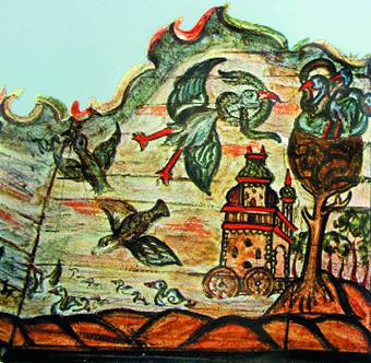 Один из фрагментов росписи могилевской синагоги. Древо Познания с гнездом,