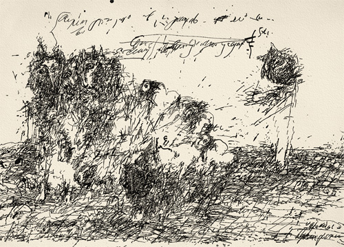 В еврействе художник видел воплощение непрерывного пути (не случайно одна из самых известных его серий называется «Благословите идущих») – причем этот путь нередко ведет и к катастрофе. Еще на рубеже 1950–1960-х годов он на огромных (два на четыре метра) листах бумаги и картона создал фрески о Моисее, о Варшавском гетто, о Януше Корчаке, покрыв ими стены мастерской. Его герои движутся, подобно буквам, их путь – это путь смысла.