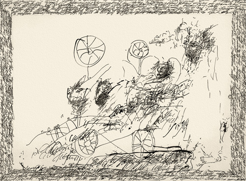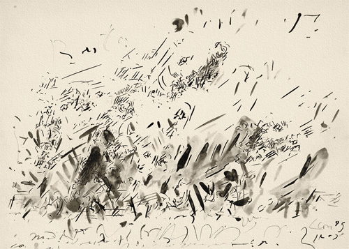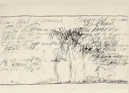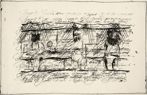 Отсюда же – и религиозное отношение к белому листу и написанному на нем слову, которое даже называли «сектантским». Художник вовсе не считал, что имеет право невозбранно заполнять мироздание своими творениями, и уподоблялся скорее не писателю, а переписчику, который набожно воспроизводит некие незыблемые сакральные тексты. Все произведение напоминает таинственные письмена, буквы то складываются в фразы псалмов, то уходят в хаос. Парадокс в том, что Лион создал образ графика-переписчика новой эпохи, словно задавшись вопросом: «Какой должна быть графика, возникшая в эпоху скорописи?» И графика его, в отличие от традиционной, соответствует не квадратному письму, а именно скорописи.