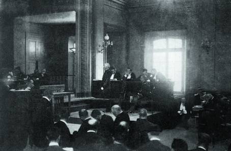 А. Дрейфус (в центре) в зале заседания суда во время процесса. Париж, 1894 год.