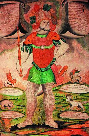 На русской лубочной картинке изображен огромный воин, которого увидел во сне царь Навуходоносор и который символизировал историю смены монархий. Смысл сна был истолкован пророком Даниилом. На шлеме, латах, одежде и на ногах колосса помещены названия монархий и царств и перечислены государи, в них царствовавшие. По сторонам от колосса помещены изображения четырех зверей, которые явились в видении пророку Даниилу.