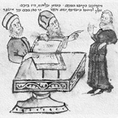 Беременная женщина расспрашивает мудрецов о состоянии своего здоровья. Миниатюра из второй Нюрнбергской агады. 1470 год