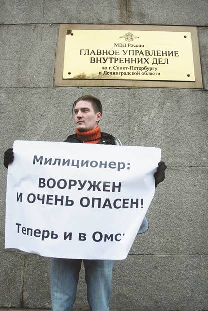 Активист «Молодежного яблока» во время одиночного пикета против милицейского