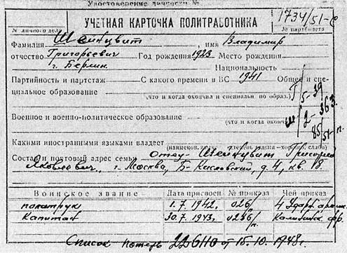 Учетная карточка политработника В.Г. Шейнцвита