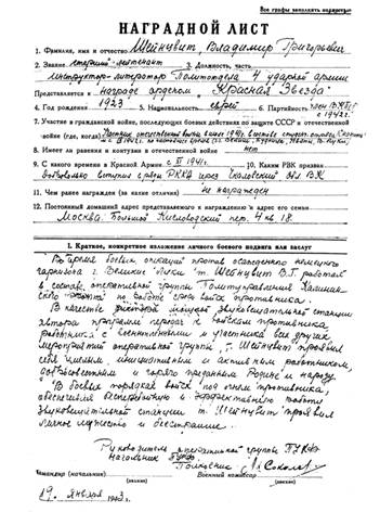 Наградной лист В.Г. Шейнцвита.