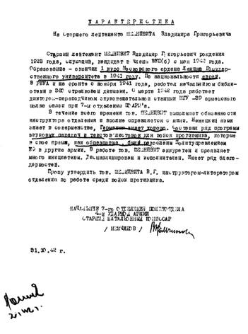 Подписано представление 19 января 1943 года. А уже на следующий день командующий войсками 4‑й ударной армии генерал Галицкий от имени Президиума Верховного Совета СССР наградил старшего лейтенанта Шейнцвита Владимира Григорьевича орденом Красной Звезды. Как сказано в документе, за образцовое выполнение боевых заданий и проявленные при этом доблесть и мужество. Боевые награды получили и другие члены этой звукопередающей установки. В отличие от других подобных документов, этот не публиковался, проходил под грифом «Секретно».