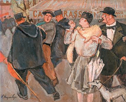 Похоже, именно ее к 1930‑м годам потерял Амшей Нюренберг. Если в 1910‑х годах он пишет работы под явным влиянием Матисса на мотивы античных мифов и французской поэзии, то теперь рядом с уголками старого Парижа появляется экспрессивно-плакатная работа «Буржуазная сволочь» (1929–1930), где демонстранта уводит парочка полицейских, а парочка буржуа наблюдает сцену в монокли. Если в 1910‑х годах его интересовали детское творчество, деформации натуры, интерес к которым, возможно, вызван работами Шагала, то в конце 1920‑х ни о каком «интуитивном поиске» речь уже не идет. Пресс идеологических установок давит в Париже не меньше, чем в России. Положение «культурного посла» от Луначарского обязывает.