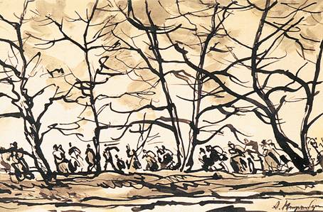 Как ни странно, отчасти чувство свободы (художественной, конечно) возвращается тогда, когда Амшей Нюренберг оказывается далеко и от Парижа, и от Москвы – в Ташкенте. Речь не о командировке 1922–1923 годов, когда он впервые попадает в Среднюю Азию для организации реставрации исторических и культурных памятников. Речь об эвакуации в 1941–1943 годах. На выставке в Музее Востока «Рахмат, Ташкент!», название которой дала строчка из Ахматовой, можно увидеть одну из лучших, на мой вкус, графических работ Нюренберга «Эвакуированные». Рисунок тушью на небольшом листе отстранен и выразителен одновременно. Он похож на кадр из фильма, где за деревьями, вдалеке от зрителей, движется бесконечная вереница людей: с детьми, груженные невеликим скарбом… Беззащитность перед небом и судьбой, бесконечность движения и людского потока. Все то, что придает этой маленькой работе эпический масштаб и пронзительный «запах сиротства», о котором писала Ахматова.