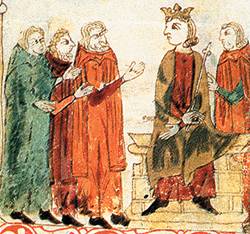 Советники короля Кастилии убеждают его изгнать евреев из страны. Книжная миниатюра. Начало XIV века