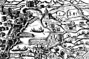 Еврейское кладбище («Sepulture de giudei») в Константинополе находилось за проливом Золотого Рога. Ксилография. 1520 год