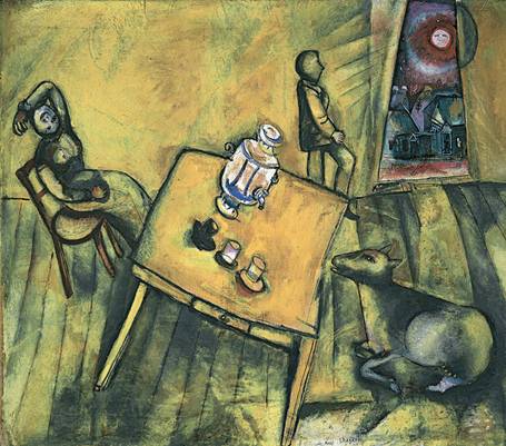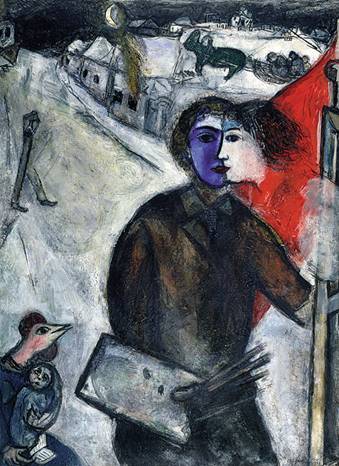 Мошка, как его звали в семье, Шагал появился на свет в черте оседлости на западной окраине Российской империи, в части «еврейской» Литвы, в местечке Песковатики, что под Витебском. «Корыто — первое, что увидели мои глаза. Обыкновенное корыто: глубокое, с закругленными краями. Какие продаются на базаре. Я весь в нем умещался. Не помню кто, скорее всего, мама рассказывала, что как раз тогда — в маленьком домике у дороги, позади тюрьмы на окраине Витебска, вспыхнул пожар. Огонь охватил весь город, включая бедный еврейский квартал. Мать и младенца у нее в ногах, вместе с кроватью, перенесли в безопасное место, на другой конец города», — вспоминал он потом, в 1930-м. Это был первый полет. Из местечка Шагал перенесся в Петербург, Париж и Берлин, Москву и Нью-Йорк, побывал в Венеции и Альпах, Италии и Греции, Палестине и современном Израиле, но побывал так, будто всю жизнь не оставлял родных своих Песковатиков. Взгляд Шагала, этот безумный, фантастический сплав иррационально-интуитивных начал, постоянно устремлен был в детство, куда-то в ночное небо, к череде звезд, к деду Марку, полжизни проведшему на печке, четверть — в синагоге, а остальное время — в мясной лавке, к бабушке Баше, не выдержавшей его праздности и умершей совсем молодой... К отцу, грузчику в селедочной лавке, чья одежда была вечно забрызгана рассолом, к матери, уступившей уговорам и отведшей сына в художественную школу к Иегуде Пэну («Да, сынок, я вижу, у тебя есть талант. Но послушай меня, деточка. Может, все-таки лучше тебе стать торговым агентом?»). К спокойной и даже мелочной прозе провинциального быта, к вывескам трактиров и лавчонок, к веренице дядь в плохоньких талитах и теть («Муся, Гутя, Реля, Хая»), парикмахеров, канторов, резников, учителей в хедере, мясников и скрипачей, «зеленых евреев», то и дело взлетающих над городом. «Ребенком я чувствовал, что во всех нас есть некая тревожная сила. Вот почему мои персонажи оказались в небе раньше космонавтов». Традиционный еврейский воображаемый мир штетла, как и литература на идише (языке, на котором художник говорил и писал, хоть и с ошибками) имели фольклорную, сказочную форму, со множеством параллелей и непредсказуемых, абсолютно непредсказуемых сопоставлений. Шагал буквально визуализировал этот мир, сделал его зримым, соединив на одном полотне разные времена, персонажей, в реальной жизни пересекающихся едва ли. Бурлящая стихия фантазии Шагала границ не знала. Но вот чего напрочь лишено было его искусство, так это повествовательности, стилизаторства, нравоучения.
