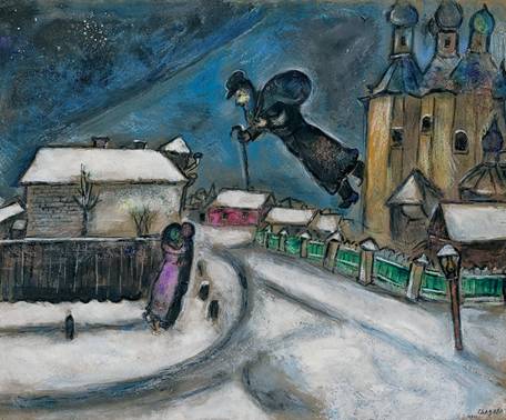 Создавать особый, еврейский, стиль ему хотелось меньше всего, да и отношения Шагала с еврейским артистическим миром было неоднозначными. Древние предания иудеев, Библия имели для него преимущественно художественный и нравственный смысл. Хасидизм оказал известное влияние на психологию и творческие интонации молодого художника. Во всяком случае, к образам космического масштаба он сознательно двигался от национальных тем.