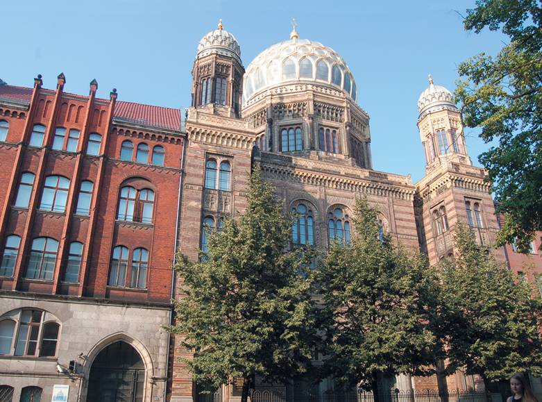 В конце же XIX — начале XX века здесь были сосредоточены еврейские молельни, кошерные мясные и книжные лавки, торговавшие литературой на идише. На Драгонерштрассе находился Еврейский народный дом, в котором беженцев из Восточной Европы готовили к репатриации в Палестину. В нем, кстати, работала и Дора Диамант, последняя любовь Кафки. Это был бедный еврейский Берлин. В минуте ходу оттуда был буржуазный еврейский Берлин — Софиенштрассе, Ораниенбургерштрассе с Новой синагогой и еврейской больницей, соседние Розенталерштрассе и Гроссе Гамбургерштрассе... Все началось в 1671 году, когда в Берлин прибыли 50 семей, находившихся под покровительством венских евреев (Schutzjuden), — прибыли и поселились здесь. Отсюда логично начать знакомство с еврейским Берлином. Выйти на станции U-Bahn (метро) или S-Bahn (наземной железной дороги) Hackescher Markt, пройдя мимо живописных Хакских дворов, выбраться на Ораниенбургерштрассе и почти сразу заметить черно-золотой купол высоченной Новой синагоги. Ее адрес: Ораниенбургерштрассе, 28–31, и пусть вас не удивляет нумерация — в Берлине номера присваиваются домам подряд, четных и нечетных сторон улиц не существует.