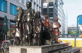 На низкой «железнодорожной платформе» стоит «детский монумент» (U-Bahn/S-Bahn Фридрих-штрассе). Это тоже в Митте: по Ораниен-бургерштрассе до конца, свернуть налево на бесконечную, прямую, как линейка, Фридрихштрассе (Берлинская стена пересекала ее дважды), квартал-другой, и вы на месте — у вокзала, с которого в 1938-м отправляли в Лондон эшелоны с детьми. На Ливерпульском вокзале в Лондоне установлен такой же памятник: семь бронзовых детей, с одной стороны бодро шагающие мальчик с девочкой — мишка под мышкой, чемодан в руках, с другой — еще пятеро потерянных, сникших, с бесполезными чемоданами, валяющимися на полу. Примерно таким было соотношение спасенных и погибших еврейских детей в Берлине: двое к пяти. Монумент называется «Детский транспорт: поезда жизни, поезда смерти». До начала войны 1 сентября 1939 года таким образом вывозили детей из Германии, Австрии, Польши и Чехо-словакии. Берлинских спасенных было 10 тыс. — брали тех, кто не достиг 17 лет и для кого находился в Англии гарант — семья, готовая его принять. На открытие памятника 30 ноября 2008 года — через 70 лет после отправления первого поезда — приехали около сотни доживших до счастливого дня спасенных, в том числе автор проекта — израильский архитектор Франк Майслер.
