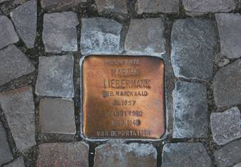 Камень Преткновения в память о Марте Либерман, жене художника Макса Либермана, покончившей с собой в ожидании депортации в квартире рядом с Паризерплац