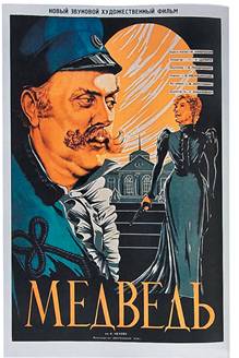 Афиша комедии-водевиля «Медведь» по пьесе А. П. Чехова. Режиссер: Исидор Анненский; в главных ролях: Ольга Андровская, Михаил Жаров, Иван Пельтцер; композитор: Валерий Желобинский; «Белгоскино», СССР, 1938 год