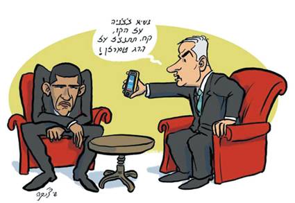 Карикатура из «Йедиот ахаронот». Нетаньяху — Обаме: «Глава Чечни на линии. Поговори, извинись за убийство Тамерлана Царнаева...»